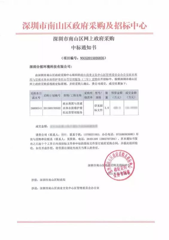 2015年10月20日,深圳合續(xù)環(huán)境科技有限公司收到了深圳市南山區(qū)政府發(fā)出的“中標(biāo)通知書(shū)”,通知中標(biāo)南山商業(yè)文化中心區(qū)管理委員會(huì)辦公室“雨水利用與景觀水體水質(zhì)維護(hù)委托運(yùn)營(yíng)管理服務(wù)”(三年)。收到中標(biāo)通知書(shū)后,我司即刻與管委會(huì)聯(lián)系洽談具體工作,并與原維護(hù)方進(jìn)入交接程序。