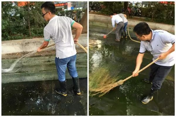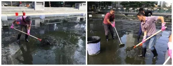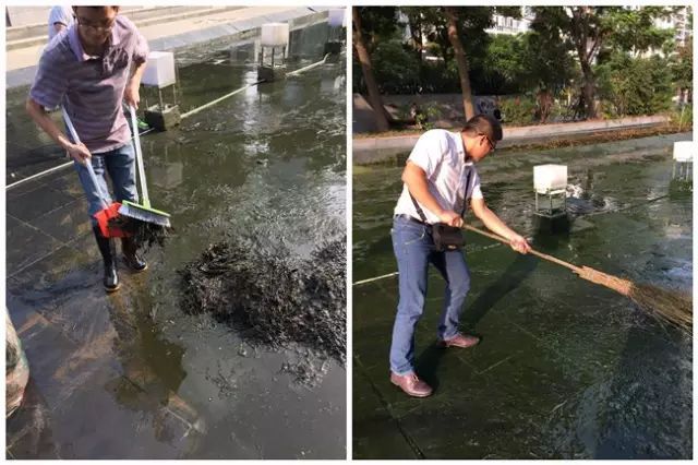 水池里面很多殘留的樹(shù)枝,需要獨(dú)自清理進(jìn)垃圾袋,同事們正齊心協(xié)力地把這些樹(shù)枝中的“頑固派”清理掉。