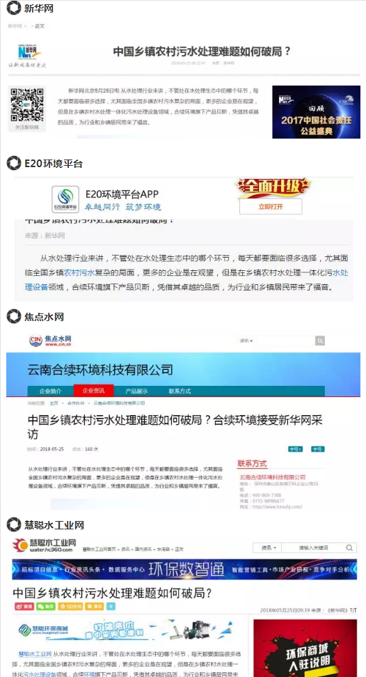 新華網本期“中國鄉鎮農村污水處理難題如何破局?”的專題報道也引發了媒體和社會的廣泛關注,本期報道也被E20環境平臺、焦點水網、慧聰水工業網等多家媒體轉載報道。在此特別鳴謝各大平臺對合續的關注與支持!
