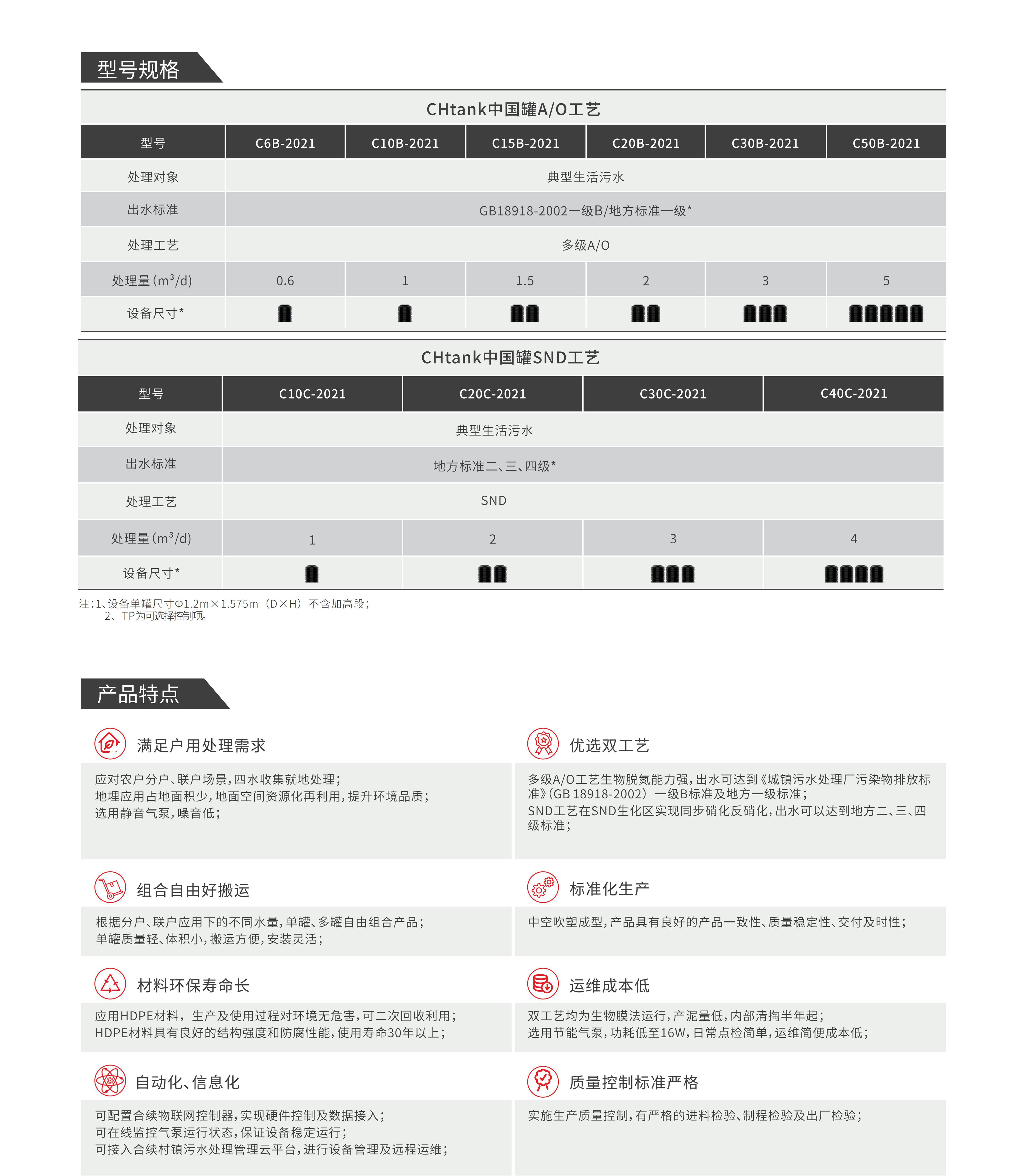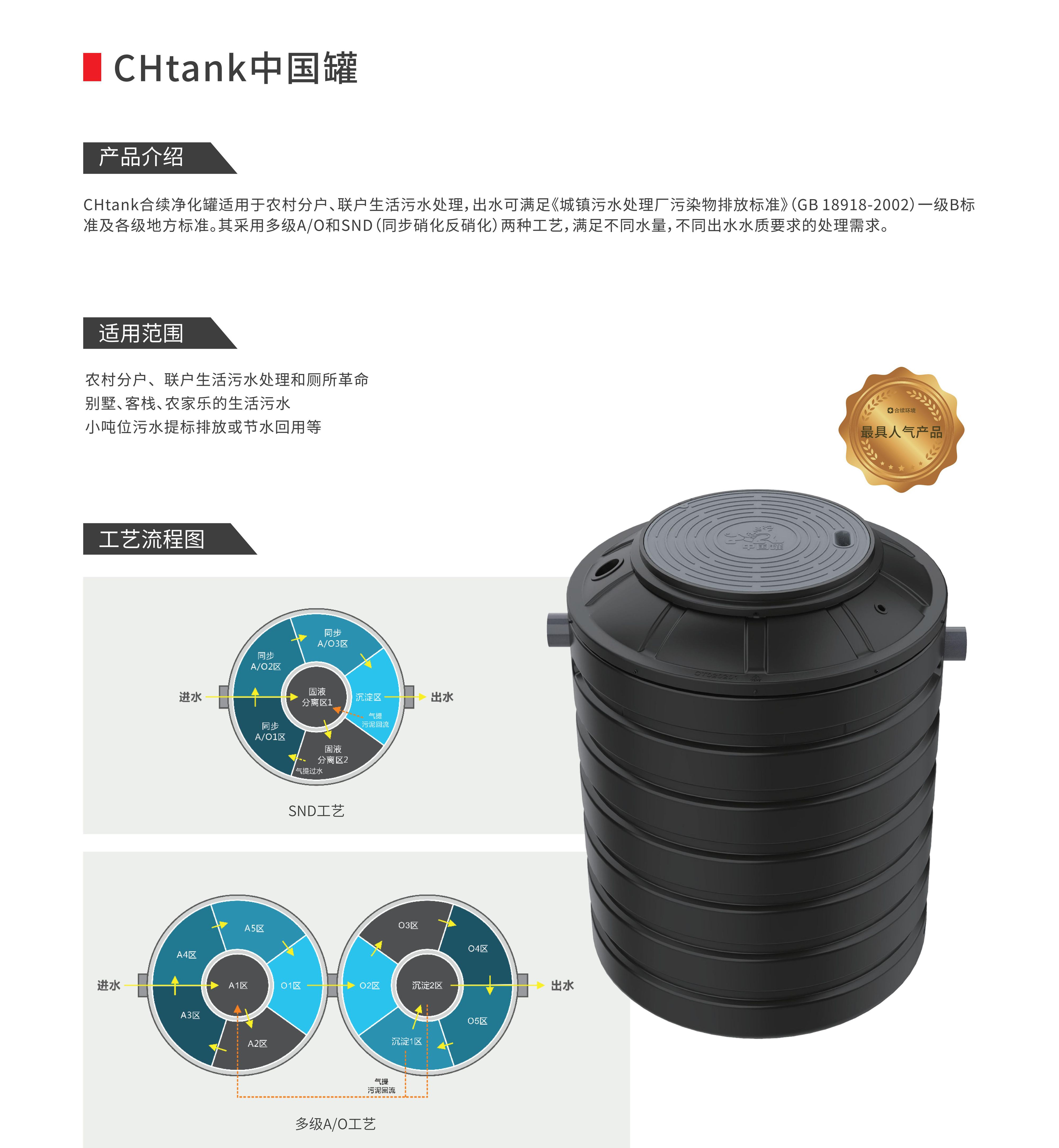 CHtank合續凈化罐適用于農村分戶、聯戶生活污水處理,出水可滿足《城鎮污水處理廠污染物排放標準》(GB 18918-2002)一級B標準及各級地方標準。其采用多級A/O和SND(同步硝化反硝化)兩種工藝,滿足不同水量,不同出水水質要求的處理需求。